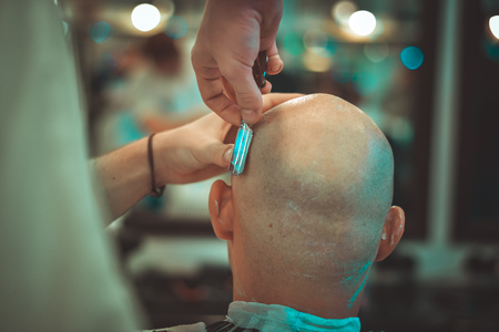 The man is shaving everything apart from the mustache. Shaving a head in a barbershop.