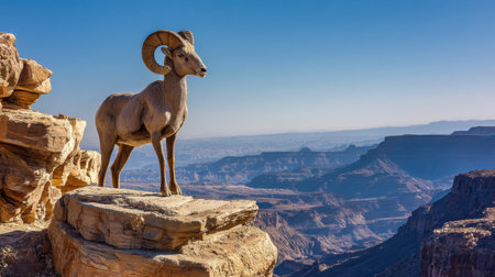 Majestic bighorn sheep on rocky mountain peak overlooking valley.