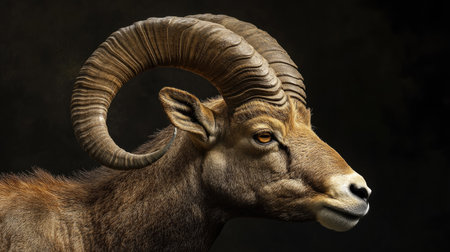 This stunning portrait captures a ram with impressive curved horns against a dark background, highlighting its serene expression and rich fur texture.