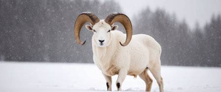 Mountain goat standing majestically on snow-covered landscape during winter season
