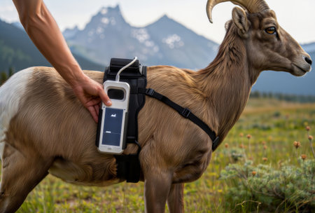 Wildlife tracking device. A researcher attaches a solar-powered tracking device to a bighorn sheep in a mountain field for wildlife conservation and scientific study.