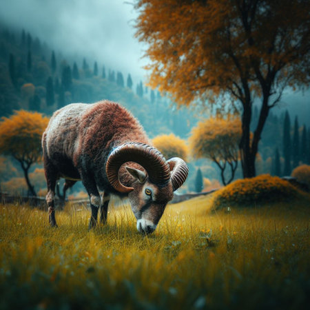 Mouflon on the meadow in the autumn forest. Vintage style.
