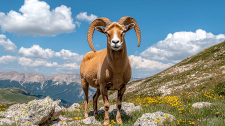 A majestic mountain goat stands proudly on rocky terrain, surrounded by vibrant wildflowers and under a wide blue sky, embodying the spirit of wilderness.