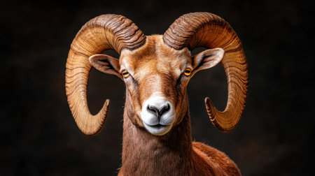 A striking close-up portrait of a ram showcases its impressive curved horns and intense gaze against a dark backdrop, highlighting its majestic beauty and strength.