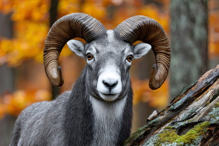 Close-up portrait of a ram with large curved horns, surrounded by autumn leaves and a blurred background