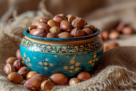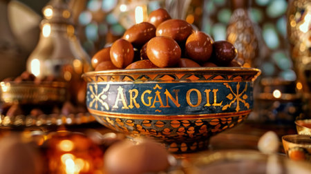 A decorative bowl filled with brown argan nuts, labeled ARGAN OIL. Concept: natural products, organic ingredients, skincare and haircare