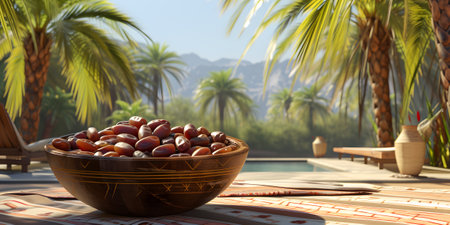 Dates in wooden bowl on the background of palm trees