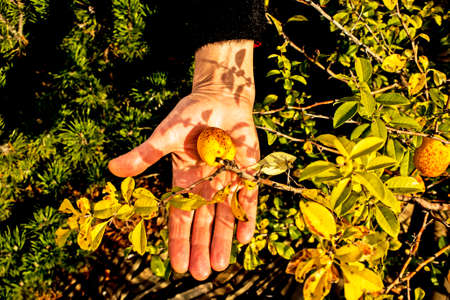 wild queen. The fruit of a wild-growing quince in the hand of a middle-aged woman.