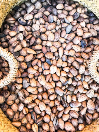 Unpeeled almonds in wicker basket