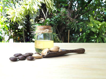Argan oil background. Argan nuts and oil on a wooden table on a empty blue background. Copy space