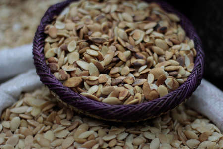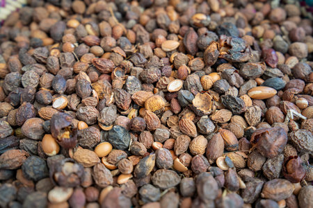 Pile of argan nuts and seeds for selling on street marketplace