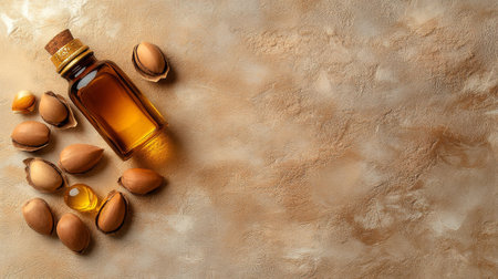 A bottle of argan oil surrounded by argan nuts on a textured background. Ideal for wellness, beauty, and natural product themes.