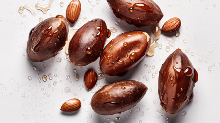Three Brazil nuts with drops of water on a White background. top view.