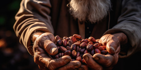 Cocoa beans in the hands of an elderly woman. Selective focus.