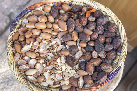 Detailed view of brown argan nuts in traditional basket. Morocco's natural skin care product, Essaouira, Morocco.