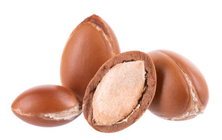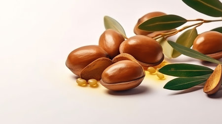 Argan seeds isolated against a backdrop of white banners. Nuts and plants containing argan oil. Background in natural oils and cosmetics