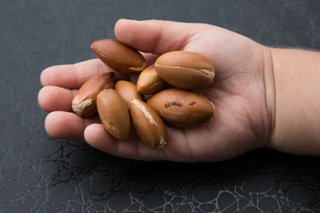 the nuts of the argan tree in hand top view close-up. Argania spinosa - Argana. High quality photo