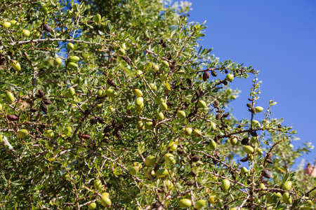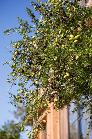 Branch of argan tree full of fresh and green fruits. Argan fruits are used for cosmetical products