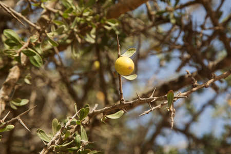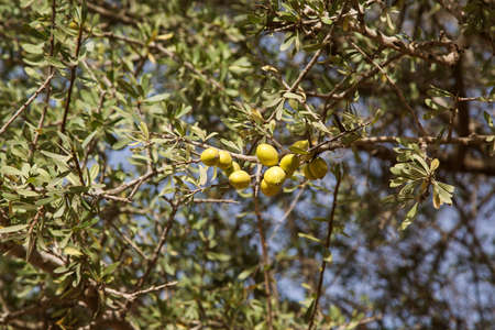 Argan nuts on Argan tree (Argania spinosa). This tree is endemic to the Sous valley in Morocco. It is cultivated for the oil (argan oil) that is found in the fruit. The oil is rich in fatty acids and is used in cooking and cosmetics.