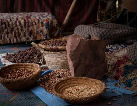 ARGAN SEEDS AND ARGAN NUTS. Making of argan oil from argan nuts and seeds in Morocco