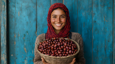 A cheerful woman in a vibrant scarf holds a basket of dates, standing against a blue wooden backdrop, exuding warmth and kindness during a festive Ramadan atmosphere.