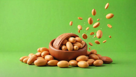 Argan oil nuts with plant. Cosmetics and natural oils background, Bright color. Generative Ai