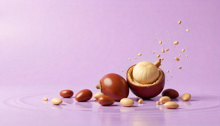 Macadamia nuts on a purple background with ripples of water