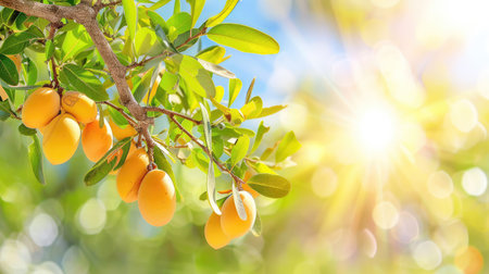 A stunning close-up of vibrant yellow fruit hanging from a branch, surrounded by lush green foliage, illuminated by warm sunlight in a natural setting.