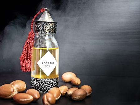 Decorative bottle with iron embossed in traditional Moroccan style with precious Moroccan argan oil and argan nuts on a dark black background with smoke