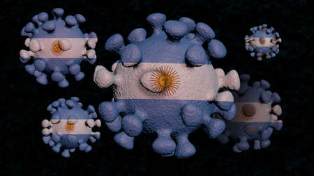 3D illustration Flu coronavirus floating over Argentinian flag, pathogen attacks respiratory tract. Argentine banner waving with pandemic of Covid19 virus infection concept. Fabric texture ensign