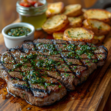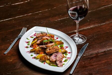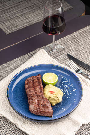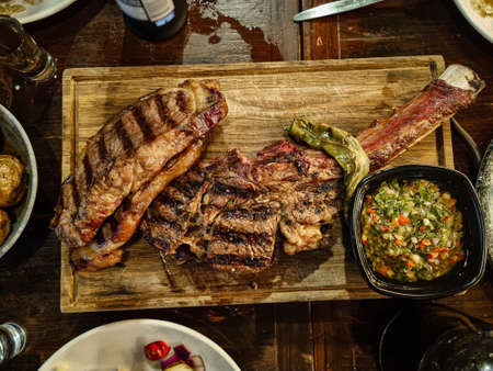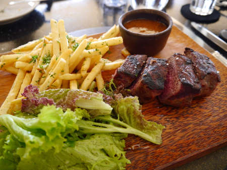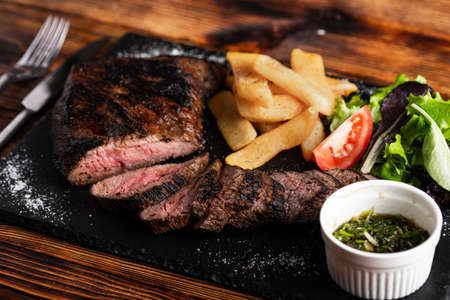 Grilled steak with potatoes and sauce on a wooden table. Restaurant