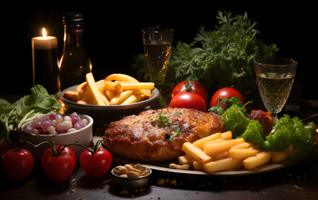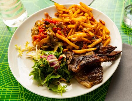French dish, grilled lamb ribs served with french fries, fresh greens and stewed vegetables