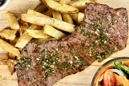 Roasted beef steak with side dish of crispy fries and Argentinian chimichurri sauce