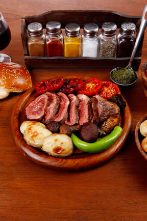 Grilled sausages with vegetables, Argentine grill, south american grilled style.