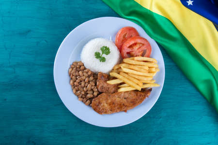 Traditional Brazilian food dish Beans rice meat and salad top view.