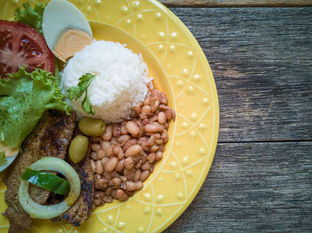 Traditional roast beef with slices of banana and gallopinto served on a wooden table. Wooden table with traditional roast meats and gallopinto