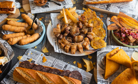 Variety of traditional Latin American fried foods laid out on a table with newspaper-style paper
