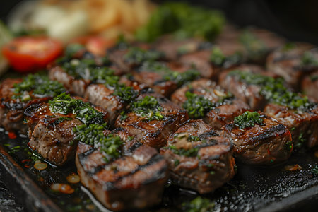 Succulent grilled beef tenderloin bites artfully presented with a fresh chimichurri topping. ideal for gourmet dining, restaurant menus, and culinary presentations focused on high-quality meat dishes. Generative AI