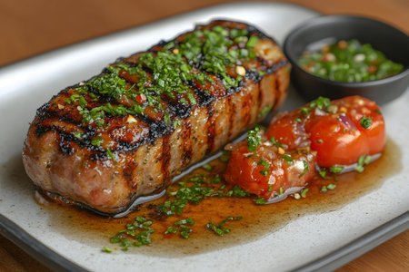 Grilled meatloaf garnished with fresh herbs and served with a side of vibrant tomato salsa, elegantly presented on a rectangular plate. the dish features rich textures and contrasting colors, appealing to gourmet cuisine enthusiasts. Generative AI