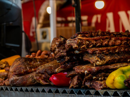 Argentinian Meat is smoking while baking on the grill in a street market