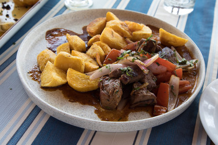 Goulash with potatoes on a plate, closeup of photo