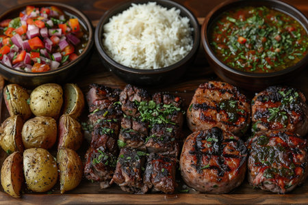 A delicious assortment of grilled meats beautifully arranged on a wooden board, featuring vibrant garnishes, sauces, and fresh vegetables, perfect for sharing.