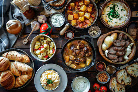 Rustic table setting is showcasing a delicious spread of homemade dishes, perfect for a satisfying meal