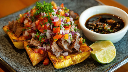 A gourmet dish of slow-cooked pulled beef and fresh salsa served over fried plantain slices, with dark dipping sauce and lime. Ideal for Latin American cuisine, savory snacks, comfort food, and restaurant menus.