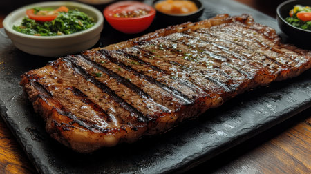 A beautifully seared steak on a dark stone platter accompanied by vibrant, fresh sides and dips.