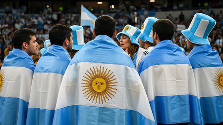 Football fans of Argentina before a game with Nigeria on June 26th 2018 at FIFA world cup in St Petersburg, Russia. Two men and a woman