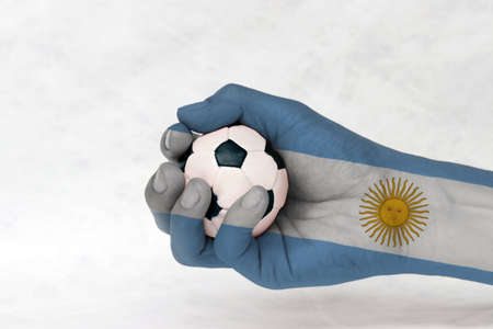 Mini ball of football in Argentina flag painted hand on white background. Concept of sport or the game in handle or minor matter.