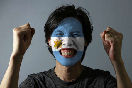 Cheerful portrait of a man with the flag of the Argentina painted on his face on grey background. The concept of sport or nationalism.