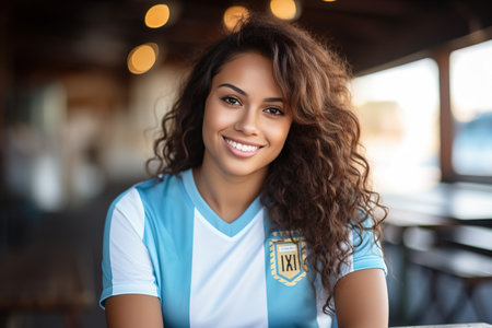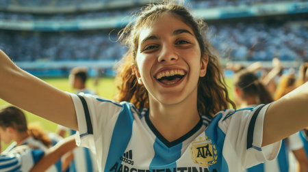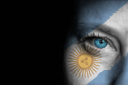Portrait of a beautiful woman with Argentina flag on her cheek looking up at the stadium