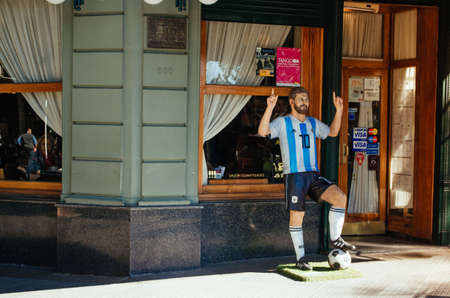 A miniature representation of Argentinas football victory, featuring the national flag, a soccer ball, and a trophy on a patch of artificial grass.
